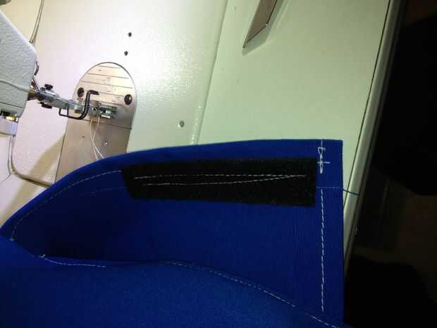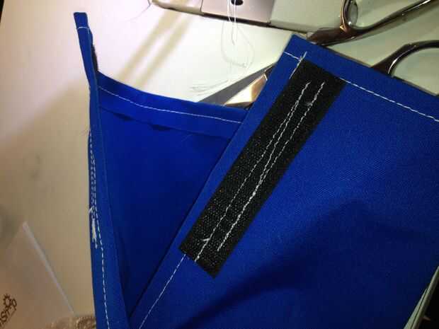 Girar la tapa hacia fuera. Trabajo como mucho fuera de la parte superior como sea posible. Coser un pedazo de velcro a los 2 bordes. Esto permite que la aleta a ser cerrada por el velcro con una cuerda que pasa a través de él. Asegúrese de utilizar un bucle y gancho lateral para el cierre de velcro. No importa que lado va como no coser en 2 de los mismos.