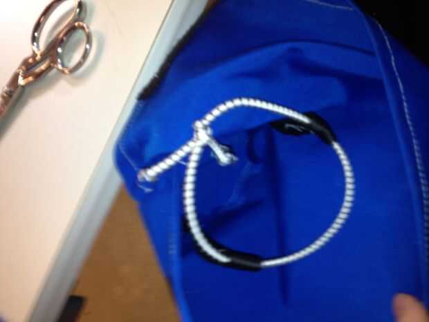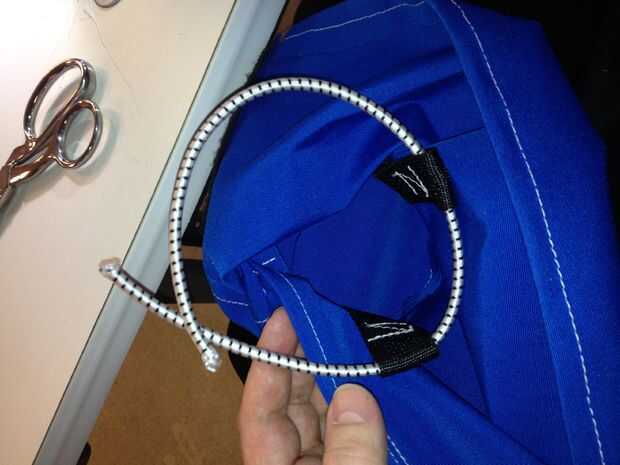 Tomar el bungee y pasar a través de los 2 lazos de las correas y ate los extremos juntos. Una curva de la hoja funciona bien por el nudo. A permanecer y no resbale hacia fuera con el bungee. El objetivo del bungee es que llevará a cabo alrededor de la brida superior del torno del barco. De esta manera cuando pones la tapa, te dejas el bungee alrededor de la parte superior del tambor del guïnche y llevará a cabo de sopla lejos.