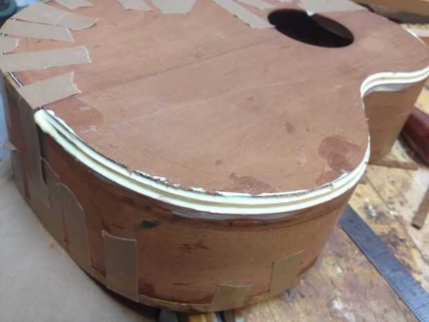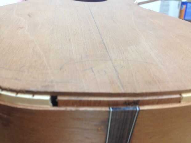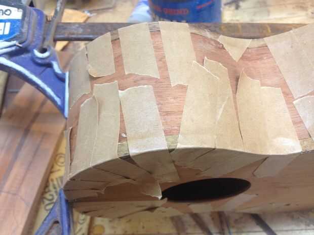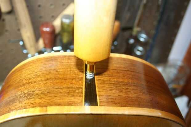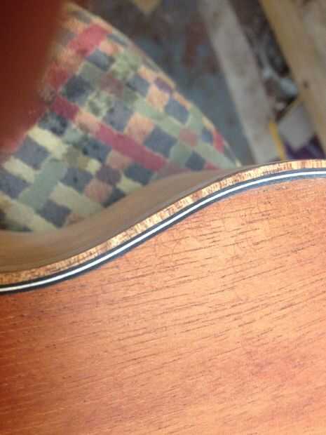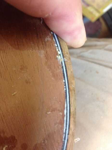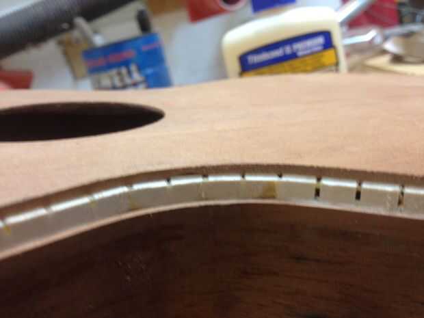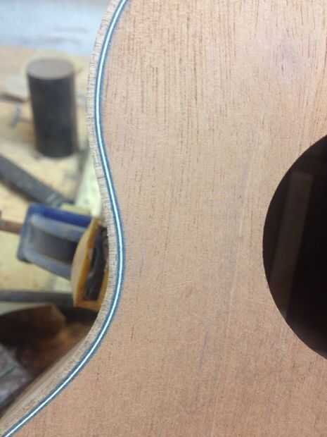 Usar un router con una broca recta y teniendo set up para mi canal de enlace. El primer cojinete deja un canal lo suficientemente amplio como para la Unión y y pruffling tan profundo como el purffling y el segundo corte es tan amplia como la Unión tan profunda como el atascamiento. ¿Hace la escena? ¡Estoy cansado! El canal en la parte de atrás es sólo para no atar purffling. Después de enrutamiento y la limpieza la pre enlace doblado es pegar con cinta hacia abajo hasta que el pegamento se seca. Usar a un gabinete scrapper para limpiar para arriba y arena plana