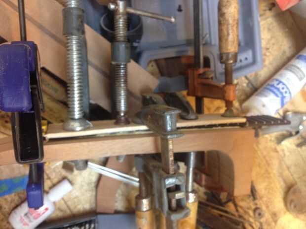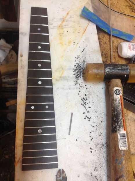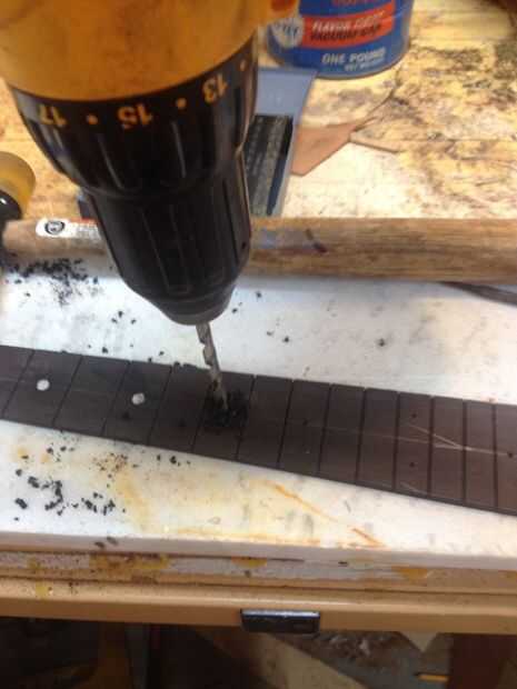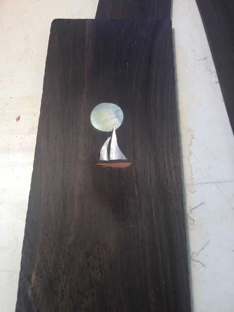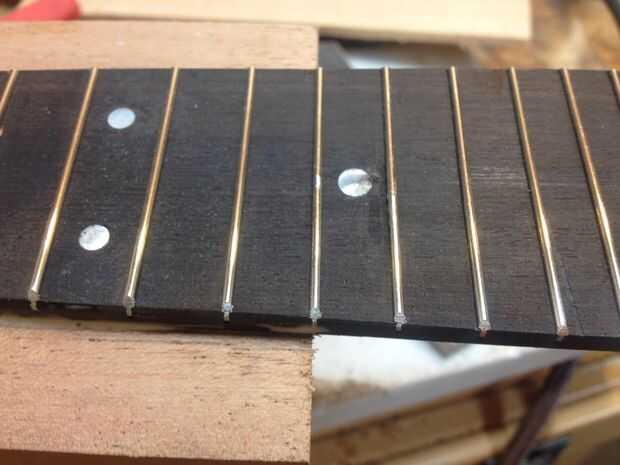 El tablero del traste es ébano utilicé una caja de ingletes de luthiers, plantilla y Sierra de traste para hacerlo. También he añadido a madre de perla puntos y partes plásticas.