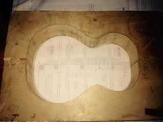 El molde es de 2 piezas cada 1/2 el uke. usando el plan como una plantilla de cortar la madera contrachapada de 3/4 y triple lo apilada y pegué a una mitad a la vez dejando los dos lados separados, esto permite el molde para dividir para marcar placas y conseguir el cuerpo terminado fuera del molde, después sujeta el molde juntos y perforado una clavija de 1" en cada extremo para la línea de fácil.