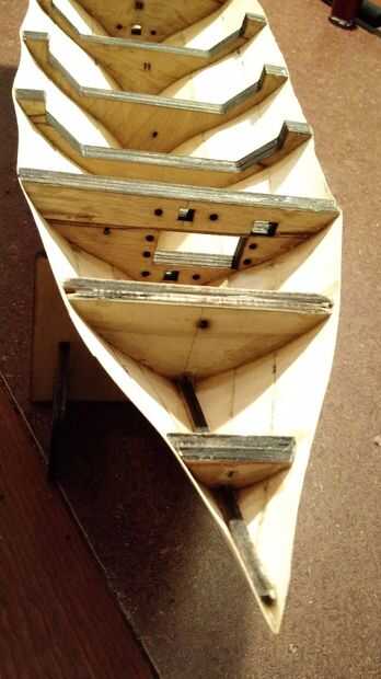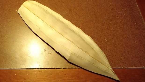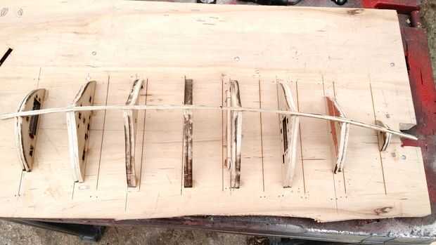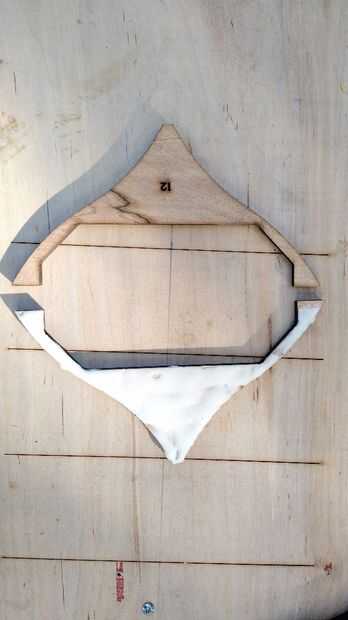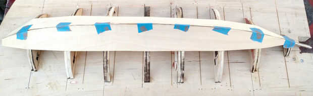 Después quité cuidadosamente el láser corta la pieza de trabajo que lijar los bordes ásperos y comencé por pegar los conjuntos correspondientes largueros asegurándose de que las piezas por las indicaciones del pegamento de la abrazadera. Después tuve juegos spar pegadas sujeta a hacer plantilla de cambio donde pude archivo las muescas a la columna vertebral. Una vez que el pegamento en el lomo tenía empecé a lijar la espina dorsal y los largueros para lograr una suave curva a lo largo de la embarcación entera para que la piel se pone correctamente sin ningún desagradable curvas.