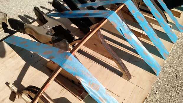 Una vez tuve mis pedazos de piel recortadas empecé les pegado al esqueleto por sujeción y cinta adhesiva les donde pude. Usé dos bolsas de tierra, arroz hubiera sido mejor, a ejercer presión para que la piel me alojé contorneada a los largueros mientras el pegamento secadas. Otra vez, comencé en la quilla y mi camino hasta la cubierta. Cuando llegué a la última pieza donde estaba la plataforma debía apuntalar el velero para que la chapa borrar la plantilla.