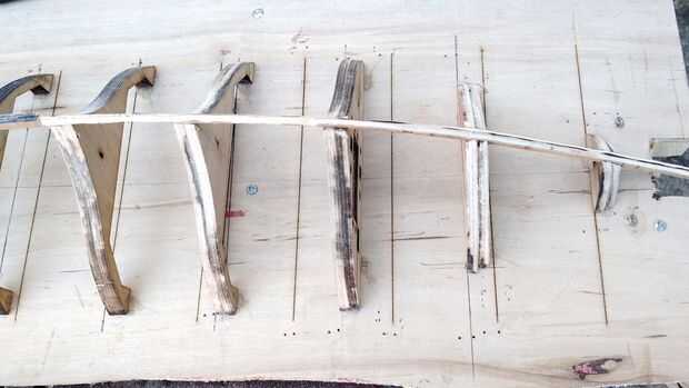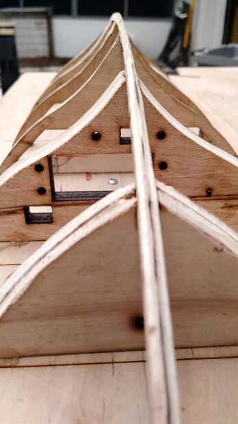 Algunas cosas me enteré de que serían útiles al construir, utilizar más y más pequeñas tiras de chapa para el barco de la piel, es más fáciles trabajar con. He intentado utilizando sólo dos piezas de chapa para cubrir cada lado pero no quieren perfilar a los largueros, por lo que terminé usando tres piezas. Es una gran ayuda cuando se intenta pegar los pedazos de piel a los largueros para sujetarlos al esqueleto una vez que lo tienes donde quieres rociar la pieza de piel con limpiavidrios que ablandará la madera. Cuando se seca después de algunos minutos retirar las pinzas y pegamento la pieza ahora formada el esqueleto de reducir el pánico y el esfuerzo necesarios cuando el pegamento se clava con tachuelas para arriba. Tenga cuidado de no esperar demasiado largo aunque porque la madera se aplane eventualmente a su estado original si se deja estar.