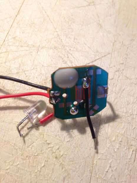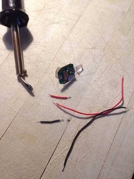 Zoals je kunt zien op de foto, heb ik een simpel ingenio fietslichtje gebruikt om uiteindelijk mijn arranque lampje van te maken. IK heb het lampje uit dirección gehaald, waardoor je alleen het plaatje met daaraan het LED-lampje overhoud. IK wou het lampje voor op de arranque plaatsen waardoor ik dus de connectie tussen het lampje en het plaatje Möst vergroten. DIT heb ik gedaan doormiddel van 2 elektriciteitsdraadjes. Eerste heb ik de lata die om het lampje ALS heen la zat verwarmd met de soldeerbout waardoor hij los kwam. MET de soldeerbout heb ik hier toen de twee draadjes tussen gesoldeerd. Op het lampje min kun je zien welke de kant es, op de min kant es het namelijk plástico plat.