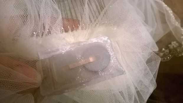Coser la bolsa del paquete de batería en el interior del velo, al lado del peine del pelo entre dos capas de velo.