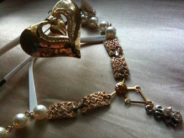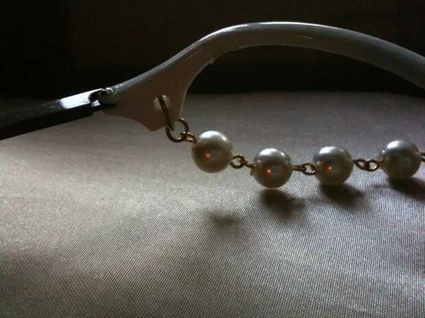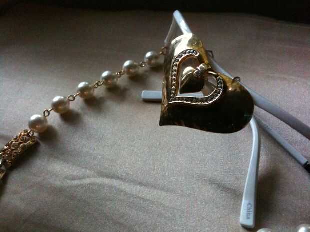 Se hace de un par de gafas de sol blancas con las lentes apareció, marcos desmontados en ciertos lugares con una estufa de leña, que se desvaneció. Entonces lija los bordes ásperos con una lima de uñas para que no te duele mi cara. Me une las perlas por medio de anillas laterales y el broche del corazón, interrumpió la clavija, cable firmemente para que no se deslice. Espero que disfruten de esta pieza de joyería recién inventado!