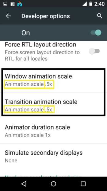 Ahora han convertido en opciones de desarrollador. Desplácese hacia abajo y ver ventana animación escala y escala de animación de transición. Toque en la ventana animación escala y cambiarlo a. 5 x como se muestra en la imagen. Y lo mismo con la escala de animación de transición a. 5 x. importante Nota: no cambiar cualquier otra cosa hasta que usted sepa perfectamente. Y que es ahora su teléfono será mucho más rápido de lo que era antes. Y sí, que esto sólo funciona en el teléfono Android. Y si este truco funciona para usted decirme hacia abajo en los comentarios.