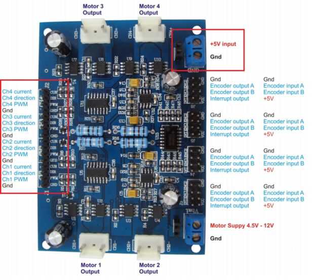 A la izquierda, hay 4 pines de entrada de canal (uno por cada motor). Cada canal tiene 4 pines (GND - PWM - dirección - actual).