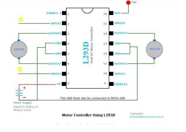 L293D es un controlador de motor dual de puente H, así que con un CI podemos interfaz dos motores DC que pueden ser controlados en dirección a la derecha hacia la derecha y contador podemos controlar velocidad de cada motor de la c.c. dando PWM para activar el pin. L293D tiene salida de corriente de 600mA y corriente de salida máxima de 1, 2A por canal. Además para la protección del circuito de salida EMF trasero de diodos están incluidos en el IC. La fuente de salida (VCC2) tiene una amplia gama de 4.5V a 36V, que ha hecho de una mejor opción para controlador de motor DC L293D.