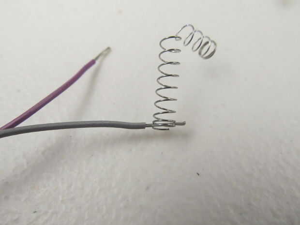 Tomar un extremo de uno de los cables y deslícelo hasta alojarlo en la base de su resorte contacto. Para hacer esto, deslice el cable entre dos bobinas del resorte y gire hasta que está pellizcado entre las bobinas planas al final. Si lo haces bien, el resorte sí mismo celebrará el cable mientras se suelda. He encontrado que una soldadura muy caliente funciona bien aquí.