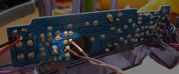 De la soldadura de los dos extremos sueltos de los cables del circuito construido en el paso anterior a la parte inferior de la bord de circuito, en el lugar donde ser resistor R1. La polaridad de los cables es irrelevante, por lo que no importa cual cable va en que agujero. Compruebe que no accidentalmente crear ningún puente de soldadura / corto circuitos.