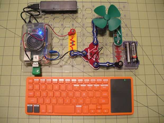 El circuito es realmente bastante simple. No queremos conectarlo directamente a la frambuesa Pi ya que esto podría provocar que el Raspberry Pi restablecer (o peor). El cable de presión circuitos puente negro está conectado al pin 9 (tierra) en la Raspberry Pi y a la terminal (-) en el bloque de batería rápido de circuitos. El cable rojo del broche de presión circuitos puente está conectado al pin 11 (GPIO17) en la Raspberry Pi y a la resistencia de 100 Ohm (que está conectada la base del Transistor de NPN). Va a utilizar el transistor como un interruptor electrónico. Cuando pin 11 a alto (3.3 voltios) enciende el transistor y corriente puede fluir a través del circuito y girar el ventilador. Cuando pin 11 a bajo (0 voltios) desconectará la corriente y no corriente fluirá a través del circuito y el ventilador dejará pronto de vuelta.
