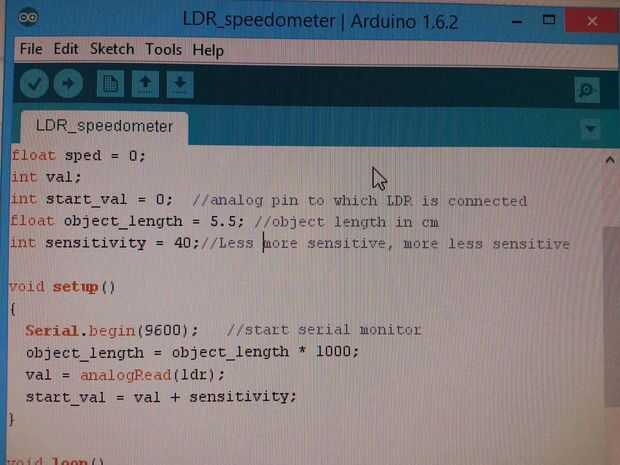 int ldr = 0; int if_val = 1; int ldr_value = 0; unsigned long time; unsigned long time2; float time3; float sped = 0; int val; int start_val = 0; //analog pin to which LDR is connected float object_length = 5.5; //object length in cm int sensitivity = 40;//Less more sensitive, more less sensitive void setup() { Serial.begin(9600); //start serial monitor object_length = object_length * 1000; val = analogRead(ldr); start_val = val + sensitivity; }void loop() { ldr_value = analogRead(ldr); if (ldr_value > start_val){ if (if_val == 1){ if_val = 0; time = millis(); } else { } }else{ if(if_val == 0){ if_val = 1; time2 = millis(); time3 = (time2 - time); sped = (object_length / time3) / 100; Serial.println(sped); } } }