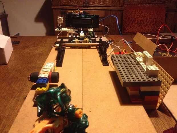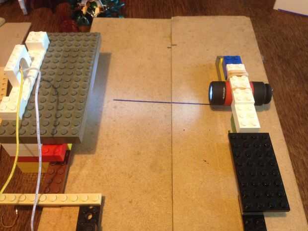 Luego construimos una superestructura de LEGO el fotosensor y fuente de luz en el lugar, casa de la barra de golpe e interruptor y sostener la pantalla en el extremo de la pista.