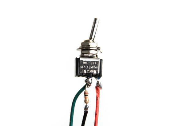 Cablear un interruptor como se muestra en la imagen de arriba. Conecte un resistor de 10kOhm y un cable verde a uno de los cables y un cable rojo al otro.
