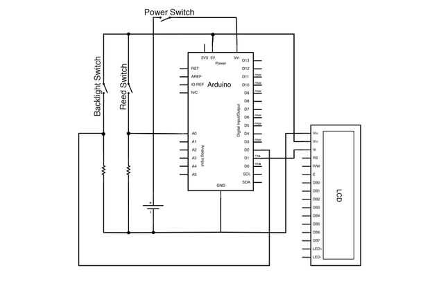 resistencias de 10kOhm están conectados a los switches reed y luz de fondo para evitar la excesiva corriente entre 5V y masa (deben nunca directamente conectas 5V y tierra en el arduino!)