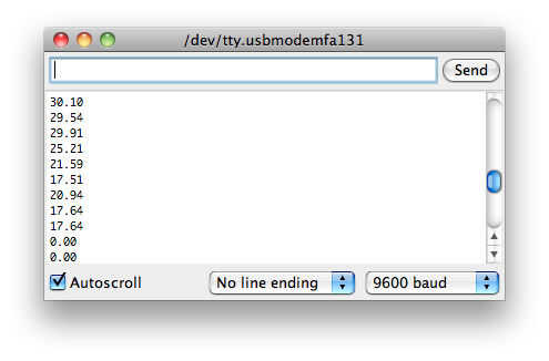 Cargar el código de abajo en el Arduino. Encienda el monitor serie. Debe salir 0.00. Empezar a girar la rueda de bicicleta, usted debería ver una impresión de la mph actual cada segundo.