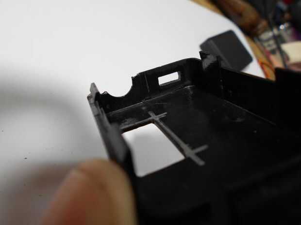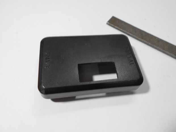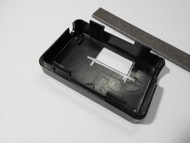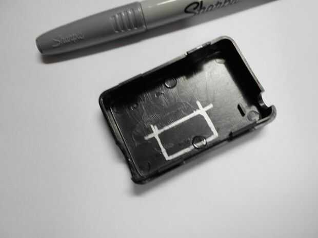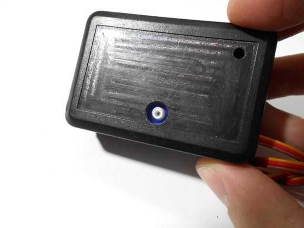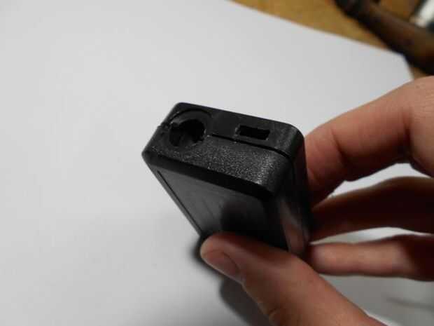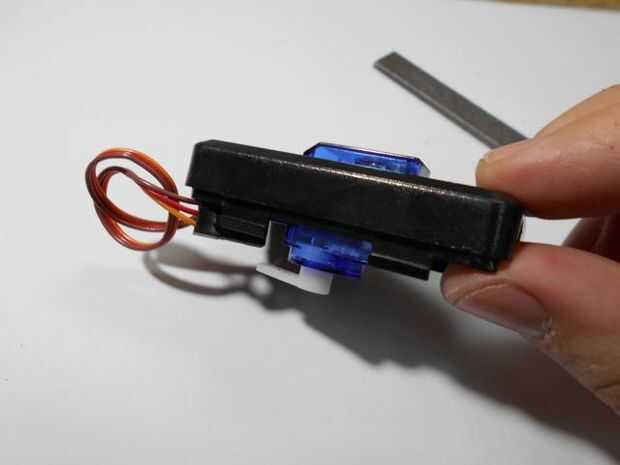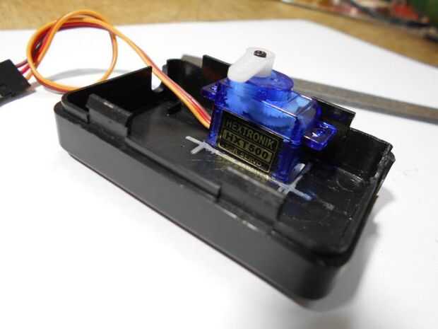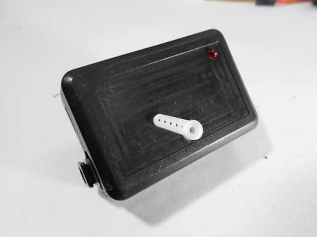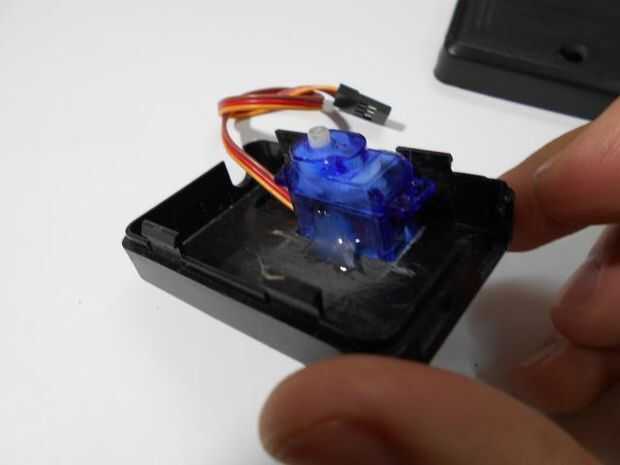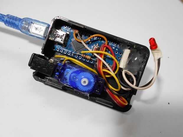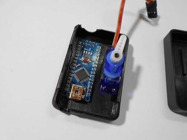 Presione los lados de la caja y se abrirá. Asegúrese que su arduino y servos dentro de la caja. El servo no se ajusta verticalmente para que la parte posterior de la misma debe estar fuera. Sorteo y Plaza en el cuadro para el corte, tiene que ser cerca de la parte inferior y un poco al lado así que el eje del final de servo en el centro de la caja. Para cortar este orificio acabo había hecho un montón de agujeros con un taladro y había terminado para arriba con un archivo. También debe hacer un agujero para el conector usb del arduino, para el led y para la caña el conector del interruptor. Coloque todo dentro y aplicar un poco de pegamento caliente para mantener todo en su lugar. Para el acabado de cortar la parte posterior de la luz y pegamento a la parte posterior de la corredera.