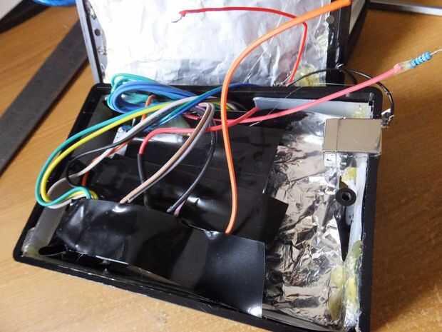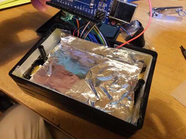 Corté un conjunto en la caja de plástico (que compré en una tienda local) que permite la exhibición del LCD en, y luego caliente-pegué la pantalla LCD en lugar. He cortado un trozo de lámina de plástico y colocado en la parte posterior de la pantalla LCD y luego he añadido algunos de aluminio en la parte superior. También agregó el papel de aluminio alrededor de la caja de plástico, incluyendo la tapa trasera y todo lo había conectado a tierra. La idea es: tratar de adjuntar la placa Arduino dentro de una improvisada jaula de Faraday (https://en.wikipedia.org/wiki/Faraday_cage) con el fin de evitar cualquier interferencia de otros dispositivos electrónicos que podrían afectar la funcionalidad de la placa Arduino. Esa es la idea, de todos modos :-) ¿Es esto realmente necesario? No sé.