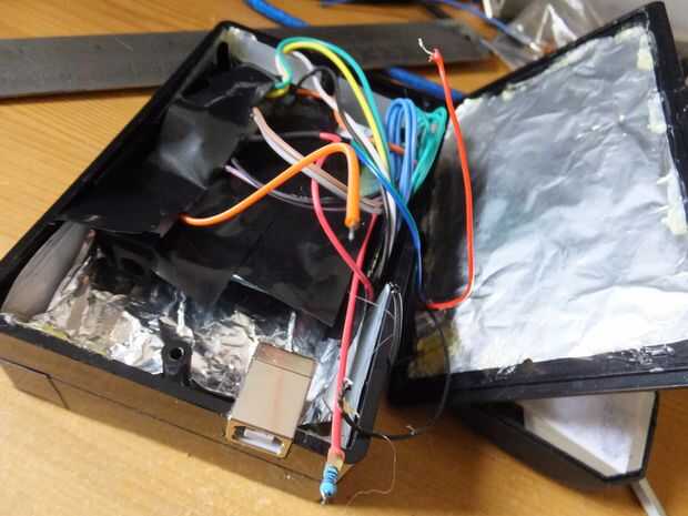 Tomé el conector USB de la placa de Arduino (no tenía otro en aquel momento y después de haber subido y probado todo antes), corté otro agujero en la caja de plástico, y allí tuve mi conexión de potencia necesaria. Se puede utilizar un conector USB adicional, si usted piensa que necesitará subir bocetos actualizados para la placa Arduino.