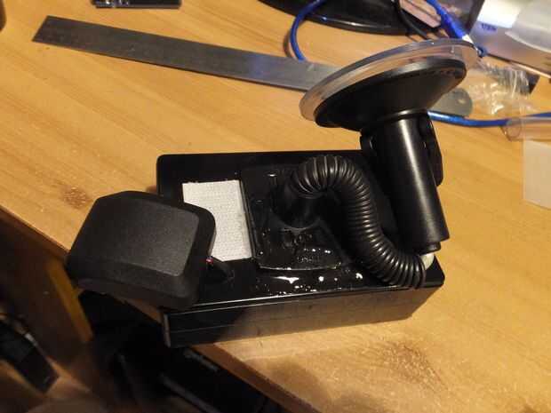 Me ha pasado a tener una taza de la succión de un viejo sat nav, que yo no estaba usando ya. Esto mantendrá la caja entera en el parabrisas del coche. El módulo GPS está conectado con algún velcro auto-adhesivo, con un pequeño agujero que permite los cuatro cables (5v, tierra, TX, RX) ir a conectar dentro de la caja.