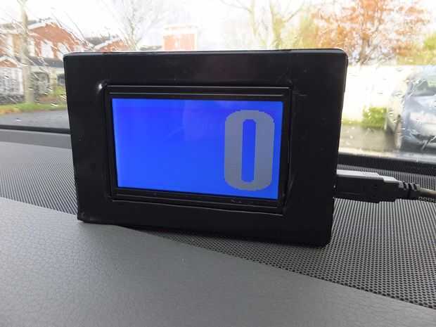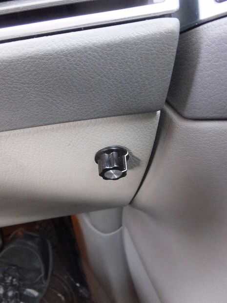 Y ahí está, el producto final situado en el salpicadero, conectado por el cable USB para la alimentación y el potenciómetro situado al lado de la rueda de manejo (tenga en cuenta, que tenga una mano izquierda conducir coche, el volante se encuentra por tanto en el lado derecho del coche)