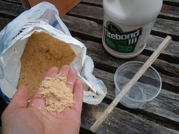 Mezcla de pegamento para madera con espesante hasta obtener textura de mantequilla de maní. Tengo una bolsa de basura llena de polvo semifino. Polvo de madera fino adecuado podría haber sido mejor; mi cola gruesa enrollada y pegada a la escobilla de goma mucho. Había masajeado el pegamento hacia abajo con mi dedo y me parece OK.