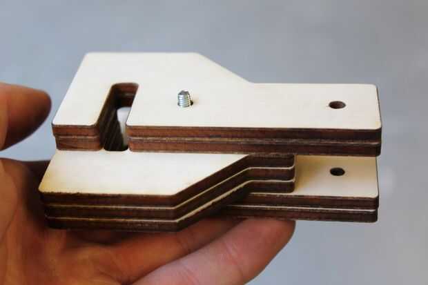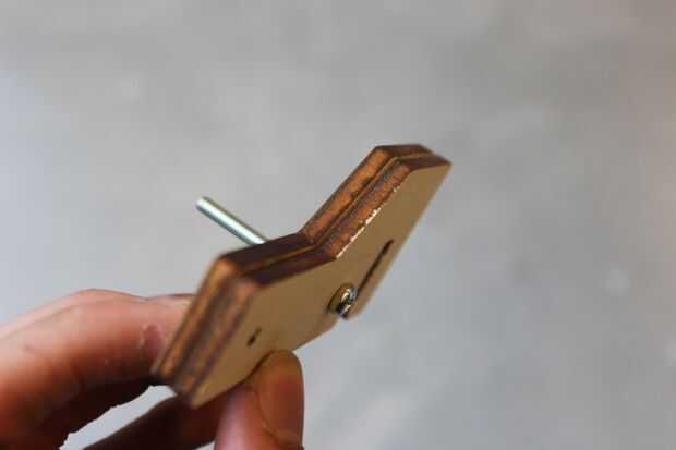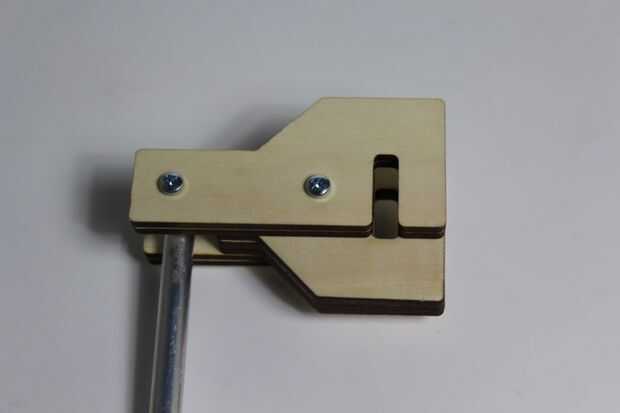 Tomar un perno de metal y empezar a colocar las piezas de madera en ella, como muestra la foto. Comience con 2 piezas grandes, luego los 3 pedazos más pequeños colocan boca abajo y terminan con otra 2 piezas grandes. Como se puede ver, creamos un agujero cuadrado. Por la presente la VeluxHelp estará firmemente fijada a la manija de la ventana como se ve en la última foto. Tome el tornillo y apriete las piezas de madera firmemente juntos.
