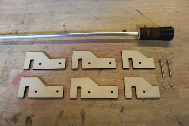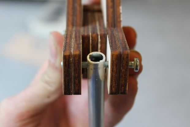 Ahora ataremos el tubo de aluminio con manija a esta pieza de madera. Iniciar con el otro perno de metal y van de un lado a través de la parte de madera. Después de que usted hizo esto, ir con el orificio del canal del tubo de aluminio este perno. Después de esto usted puede terminar con el otro lado de la parte de madera que va con el canal de la mancha. Si lo hiciste correctamente, usted verá que el tubo de aluminio puede girar alrededor del perno, pero se ha quedado atascado entre dos piezas de madera. Atornille la tuerca en el perno y el VeluxHelp está listo para su uso!