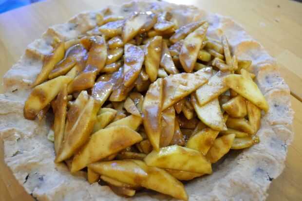 En un tazón grande, mezcle las manzanas en rodajas con 1/3 taza de azúcar morena oscura, 3 cucharadas Harina de trigo integral, 2 cucharadas jarabe de arce, 1/2 cucharadita de canela, 1/4 cucharadita de nuez moscada, 1/8 cucharadita pimienta, 1/8 cucharadita de cardamomo y pizca de clavo de olor. Coloque la mezcla de manzana en la base de tarta de 9".
