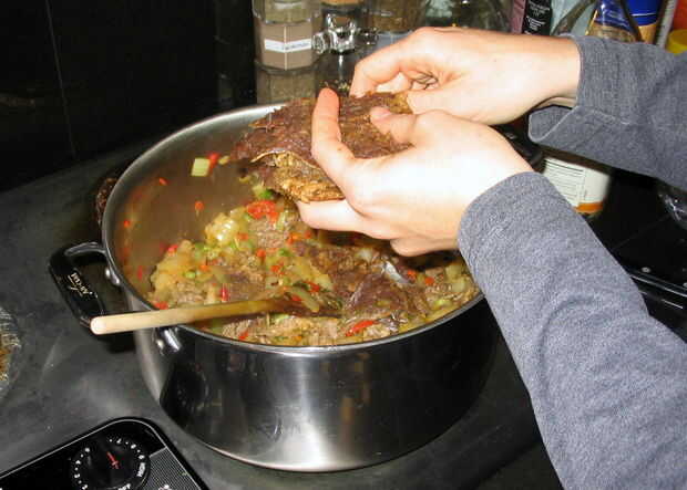 Por lo tanto, añadir la carne: cortar trozos de carne, filete del cubo de Polylepis o volcado sólo en carne molida. Aquí estoy purgando manualmente el filete del cubo.