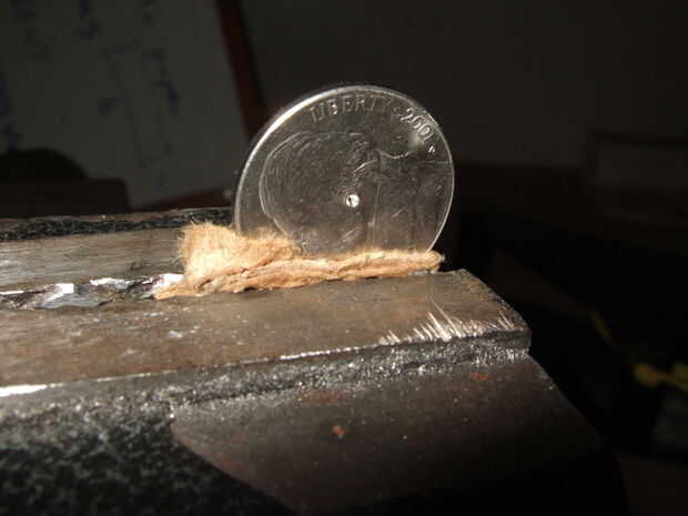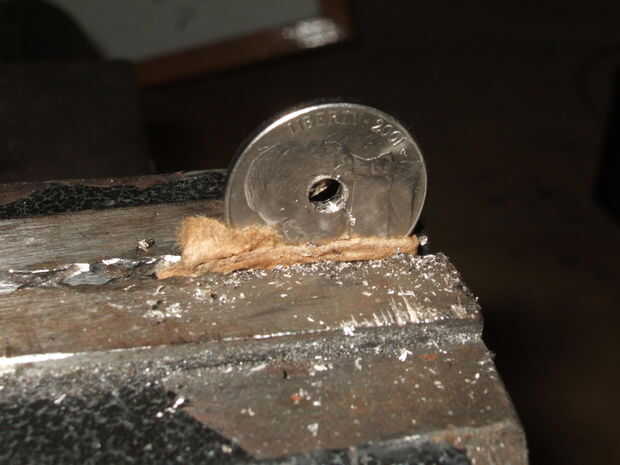 Comenzar perforando un pequeño orificio en el centro, esto evitará que cualquier perforación adicional o escariado en el centro. Uso cartulina de sandwich la moneda cuando agarre en la prensa para proteger de rasguños del vicio.