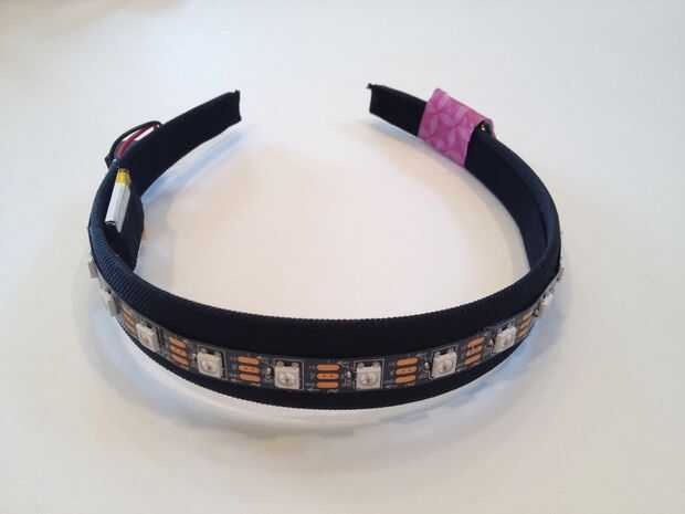 Medir el contorno de la cabeza entre las marcas del lápiz. Nuestra era unos 10", perfecto para una 9" tira de LEDs con espacio suficiente para un enchufe interruptor y pila.