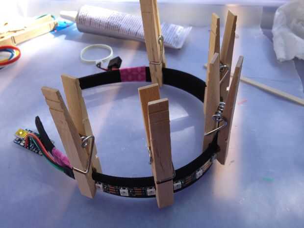 Aplicar una fina capa de adhesivo a la montura y presione la tira de NeoPixel, asegurándola con pinzas a medida que avanza. Verifique que la tira no es torcida - usted tendrá solamente un minuto o dos para cambiarlo antes de que el adhesivo empieza a.