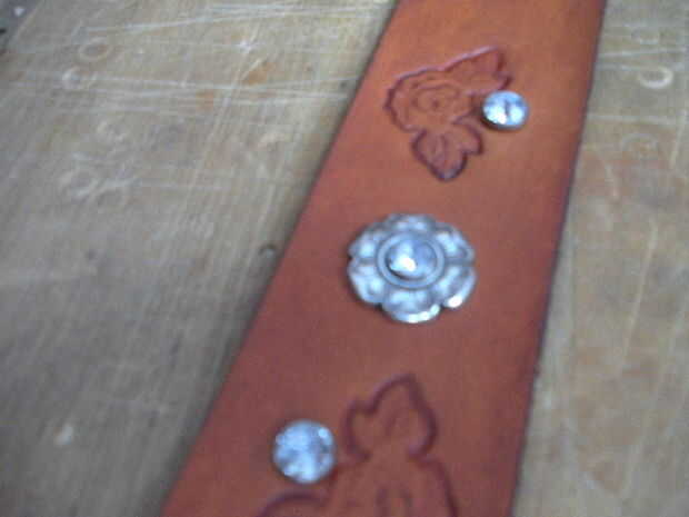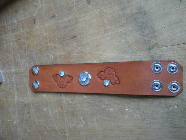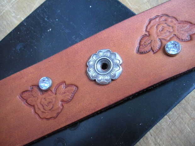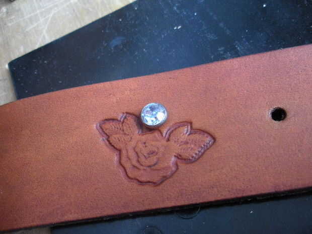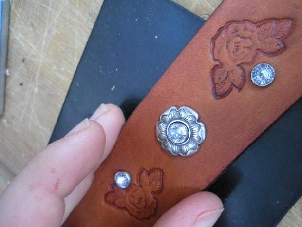 También venden cosa de bisel que enmarcan el remache. Solo ponlo entre la piedra y el cuero y pop la tapa en la parte posterior.