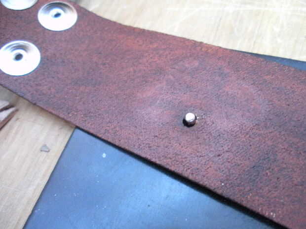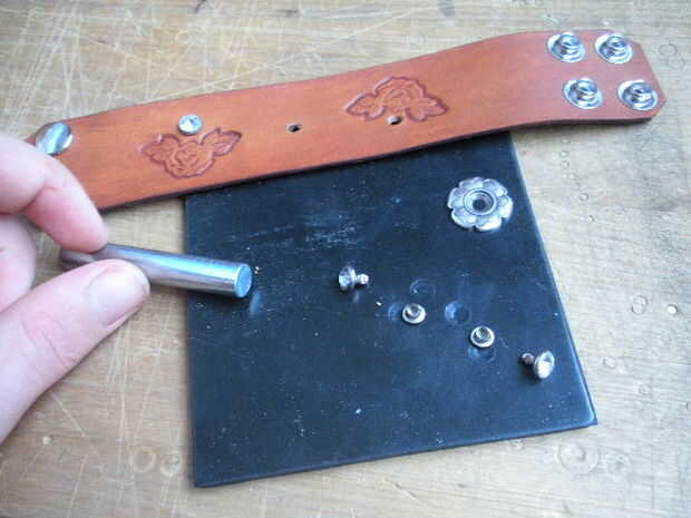 Hacer un agujero en la piel. Este agujero debe ser lo suficientemente grande como para dejar la parte de "tapa" del remache a través. Empujar el perno de piedra en y colóquelo boca abajo sobre una alfombra de goma. Se vende una colchoneta especial para esto, te recomiendo conseguirlo. Coloque la tapa en y toque con herramienta y mazo. Un grifo es realmente necesita, "pop" juntos muy bien.