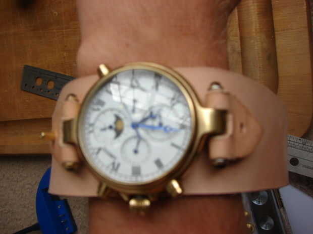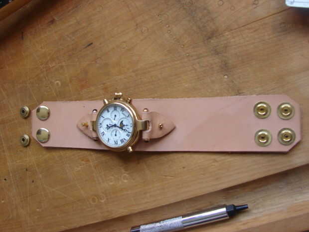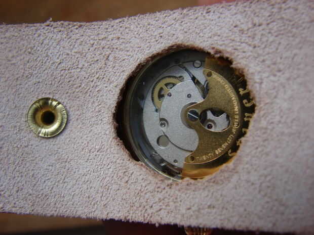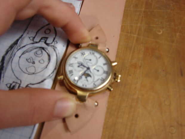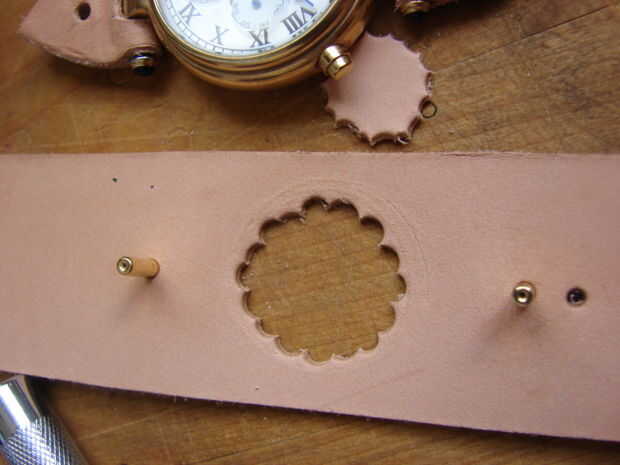 Si tienes un reloj con pilas (no recomendado), o uno como el mío con una ventana de visualización de lujo en la parte posterior, marque y corte un agujero. Usé un ponche de cuero y una maquinilla de afeitar cortar hacia fuera.