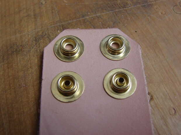 Tiempo ahora para colocar los broches de presión. Voy a utilizar dos lado - por - lado, espaciado uniformemente. También quiero ser capaz de ajustar más grandes en caso de que por algún milagro mi muñeca consigue más gruesa. Para los broches de presión que serán en el exterior, usaré el extremo hembra, debido al tamaño más grande. Mensajes masculinos, cuatro de ellos en el interior. ¿Recuerde que hemos añadido una pulgada o dos pulgadas a la medida de tu muñeca? Esto es para permitir que el hardware. El centro del hoyo y además el hardware snap, debe ser la mitad de una pulgada en el borde y para el "cierre de Ajustador", un año y medio desde el borde. Marque y perfore estos agujeros. Seque el hardware de montaje.