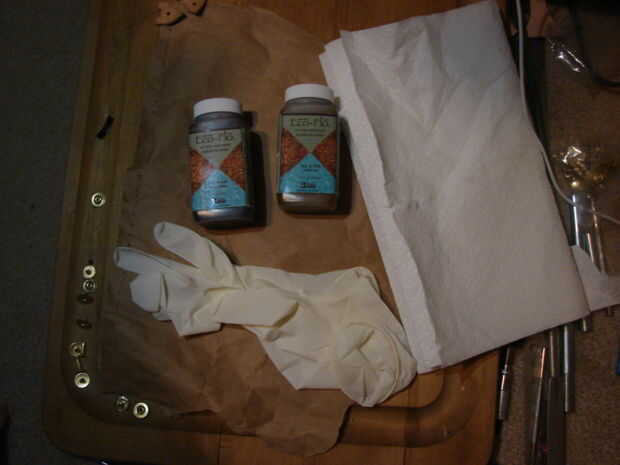 Proteger la superficie de trabajo. Sacudir la botella, después de confirmar la integridad de la tapa de la botella. Sumerja una toalla de papel o trapo limpio en la mancha, sólo necesita un punto. Aplicar a un trozo de cuero. ASEGÚRESE DE QUE ES LO QUE QUIERES! Tinte a base de agua toma un momento para poner en, pero eso no significa golpear sobre y dejarlo. En un movimiento circular y fluido (debido al pequeño tamaño de este proyecto a hacer trazos horizontales, recomiendo circular en grandes artículos como billeteras monederos etc.) aplicar el tinte al elemento, luego limpie con una toalla de papel de trapo limpio de donde comenzaste. Limpie en, limpie. Repetir. Continuar hasta que llegue el color que desee. Que establece durante unos 3 minutos a temperatura ambiente. Luego limpie con una toalla de papel limpia. Si es demasiado ligera, puede aplicar más, si es demasiado oscura, mal.