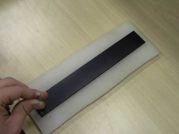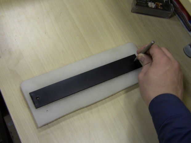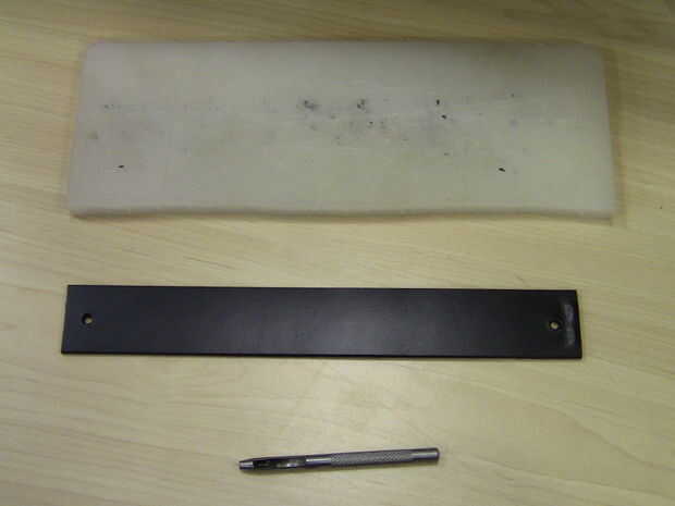 El agujero que hace la herramienta del gancho agarrador y hacer dos agujeros de las partes externas de la piel. Hacerlos cada uno sobre una mitad de una pulgada en el borde exterior de la tira de cuero.
