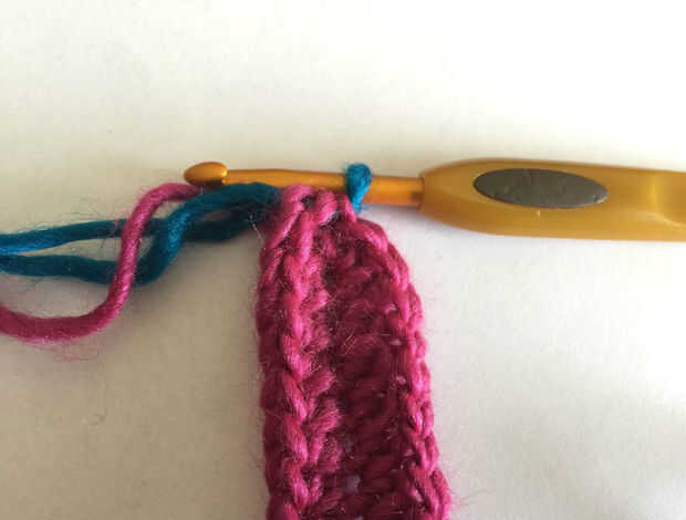2hdc en la segunda cadena del gancho. HDC 77. 5hdc en la última cadena. Ahora trabajando en el lado opuesto de la cadena, hdc 77. 3hdc en la última cadena (que es también donde pones 2 hdc al principio de esta fila). SS en la parte superior de la primera puntada. Antes de tirar el hilo a través de SS, cambian de color si lo desea. (164)