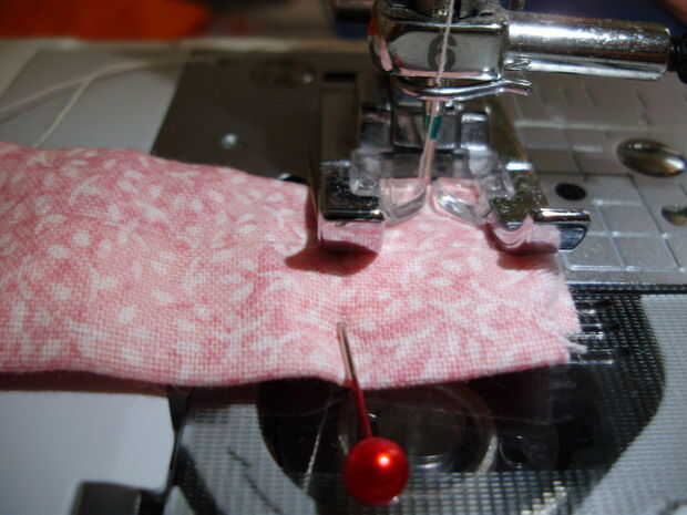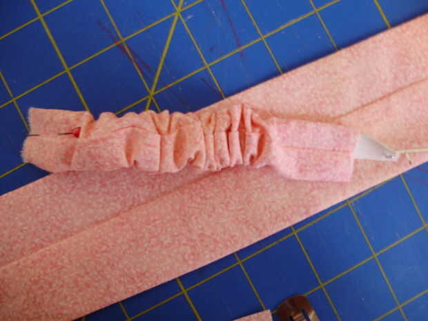 Coser ambos extremos del tubo más pequeño para asegurar el elástico. Puede coser en la tela, aunque es el "lado derecho". Se ocultará en el paso siguiente.