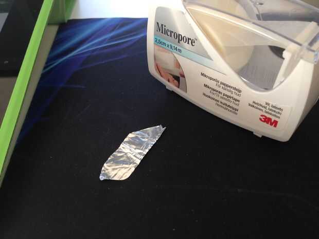 • Un pedazo de papel aluminio (corte un pequeño pedazo del envase de aluminio para llevar desde la cena de ayer, tenga cuidado de no conseguir cualquier alimento picante en la herida aunque