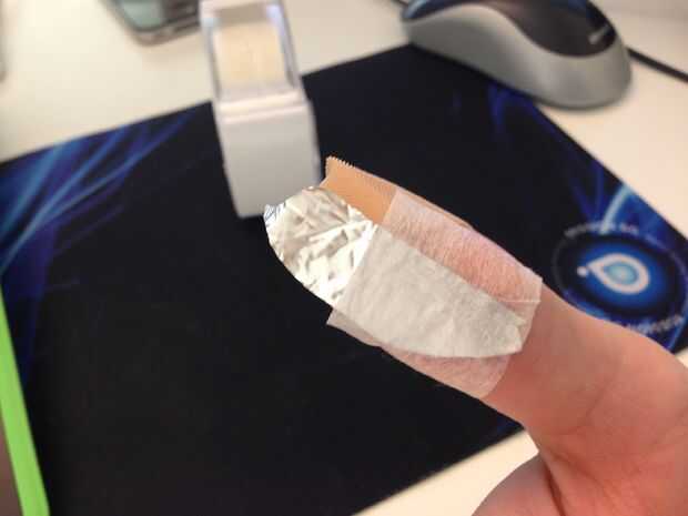 Poner el pedazo de papel de aluminio por lo que recorre una buena cantidad del área que se va a la pantalla táctil y su piel.