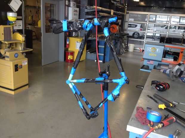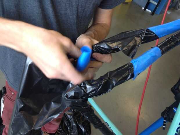 Envuelva alguna cinta alrededor de cada uno de los tubos de la bicicleta de 2 o 3 pulgadas lejos de la zona dañada. Cinta de pintor azul funciona bastante bien para esto pero asegúrate de que pones unas pocas capas. Un poderoso bláster de arena puede ser capaces de obtener a través de una o dos capas.