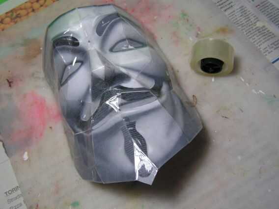 Esta es la primera y más importante paso en la secuencia. Tienes el modelo de papel a prueba de agua. Utilicé tiras de cinta adhesiva transparente. Una vez terminado, la máscara debería verse como esto.