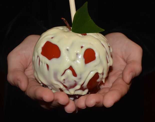 Llevó mi familia no tan asustadizo de Halloween de Disney este año. Era nuestra primera vez para Halloween. Como estábamos deambulando y teniendo en la mira, nos encontramos con una tienda de dulces con un caldero burbujeante en la ventana. La reina malvada fue colado por sus malvados pociones y sosteniendo en su dedos retorcidos una perfecta caramelo manzana con chocolate blanco goteado sobre la parte superior para parecerse a una calavera. Las siguientes instrucciones son mi versión de cómo recrear este convite de Disney.