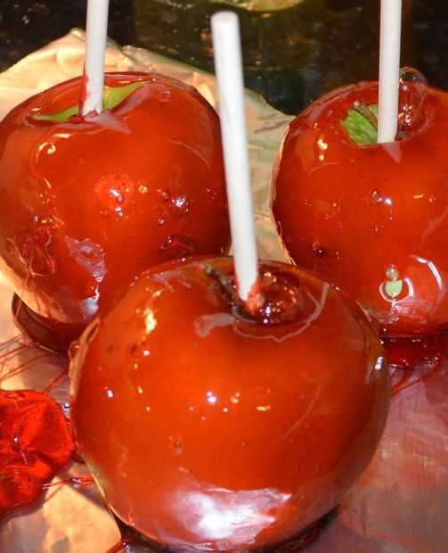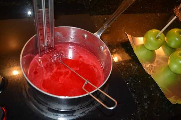 Asegúrese de añadir los palitos de madera de la manzana y luego agitar la manzana en la olla hasta que se cubra de caramelo.