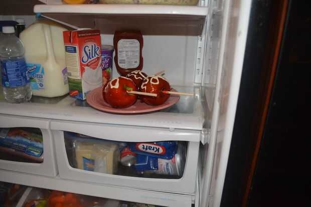 Una vez que tengas la cara hilo, coloque las manzanas en el refrigerador a dejado el conjunto chocolate. Si se salta este paso, el chocolate solo se ejecutará por la cara de la manzana.